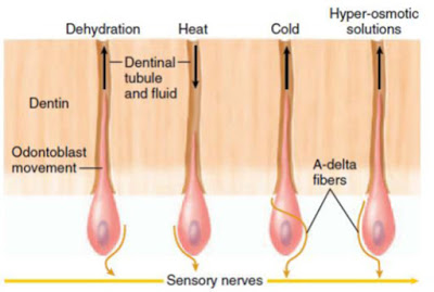 Như được mô tả ở những chương sau này, sự di chuyển của chất lỏng trong các ống ngà kích thích các nguyên bào ngà và các sợi thần kinh A-delta dẫn truyền nhanh liên quan trong tuỷ răng, gây ra phản ứng đau nhói, nhanh, hồi phục lại ngay sau kích thích. Các ống ngà càng mở (chẳng hạn như một xoang răng vừa mới tạo, mất khoáng ngà răng, nạo túi nha chu, tẩy trắng răng hoặc nứt thân răng) dẫn đến sự di chuyển của chất lỏng trong ống ngà càng nhiều, và sau đó răng càng trở nên nhạy cảm ngà hơn khi bị kích thích. Khi chẩn đoán, điều quan trọng là cần phân biệt giữa nhạy cảm ngà và viêm tuỷ có khả năng hồi phục (thường là thứ phát sau sâu răng, chấn thương, miếng trám mới hoặc miếng trám sai). Cần thăm hỏi bệnh nhân kỹ lưỡng về những điều trị nha khoa gần đây (mà thường bác sĩ sẽ không biết được nếu chỉ khám lâm sàng và X quang) để phân biệt giữa nhạy cảm ngà và bệnh lý tuỷ răng, vì phương thức điều trị của mỗi bệnh hoàn toàn khác nhau.