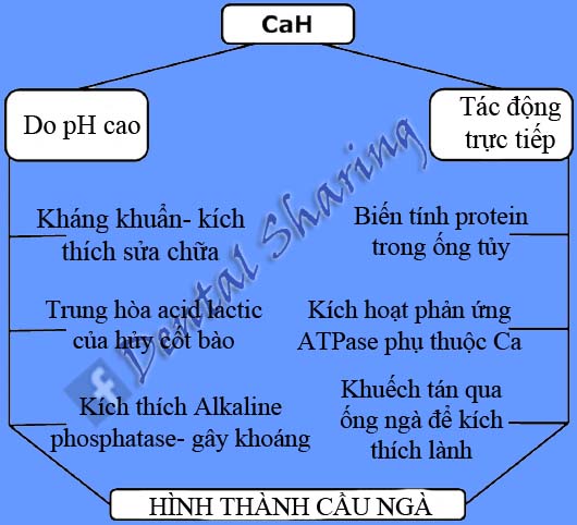 (y) Năm 1920, Hemanm dùng Ca(OH)2 để che tủy trực tiếp, gián tiếp, kích thích đóng chóp, kích thích sự hình thành chân răng, điều trị tiêu ngót chân răng, thủng chân răng, gãy chân răng, cắm răng lại, băng thuốc trong nội nha… Mặc dù được dùng với nhiều mục đích khác nhau nhưng cơ chế hoạt động vẫn chưa thực sự rõ ràng. Giả thiết do độ pH cao và do tác động trực tiếp của Ca(OH)2 khi tiếp xúc mô.