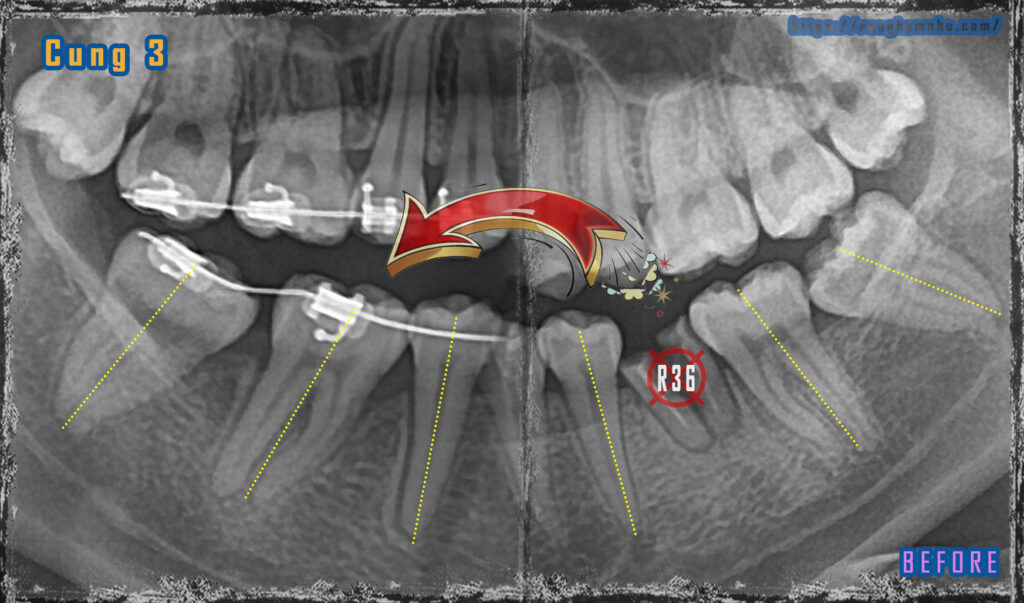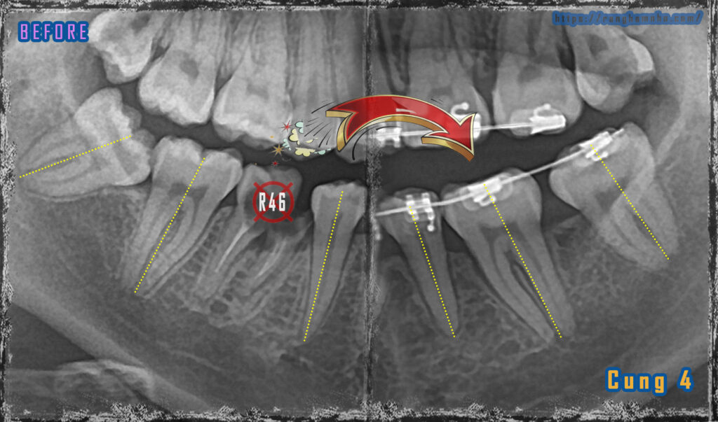 Hình ảnh Răng 46 được nhổ bỏ, R47 di về R46, R48 di về R47. Các trục răng song song- cả thân và chân răng đều dịch chuyển. Có 1 chút khó khăn là răng 48 mọc lệch nghiêng gần, rất vất và để dựng được trục răng 48 và dị gần về thay thế tại vị trí R47.
