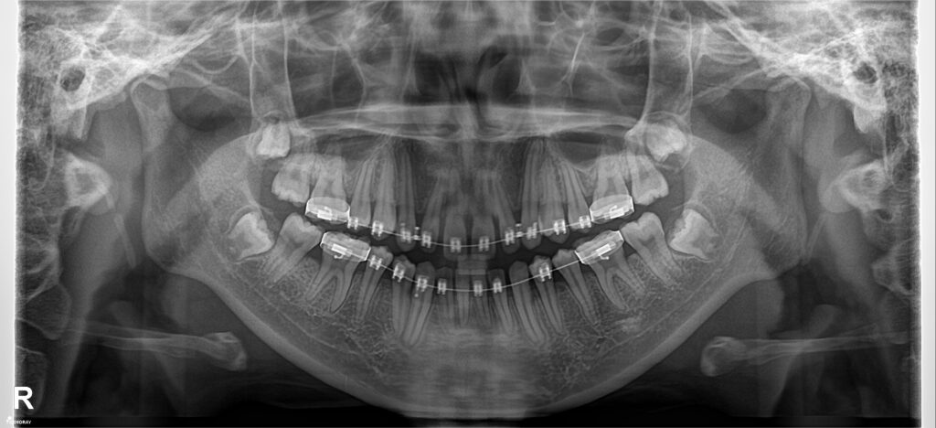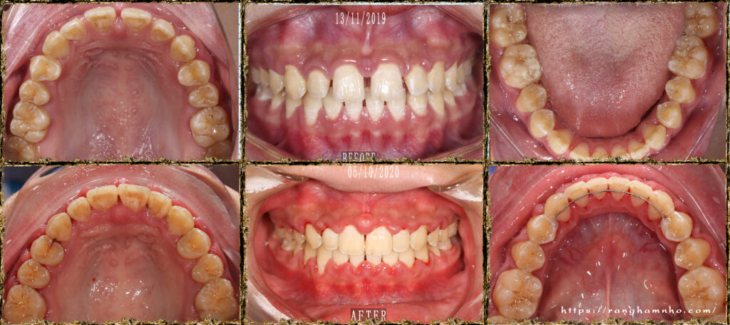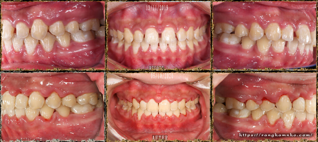 Kết quả: đường giữa đẹp, khớp cắn ổn sau 1 năm điều trị. Tuy nhiên, BN đeo niền lâu & yếu tố tuổi dạy thì làm tình trạng việm lợi- phì đại lợi tồn tại. BN được tháo mắc cài, hướng dẫn CSRM kĩ lưỡng kèm mát xa lợi, đeo hàm duy trì máng trong. Kết qảu tái khám rất ổn sau 6 tháng.