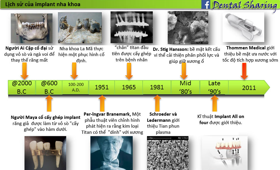 (y) Trong y học, thuật ngữ implant dùng để chỉ những dị vật nhân tạo (khớp giả, răng giả…) được đưa vào cơ thể. Trong nha khoa, Implant có bước tiến đột phá kể từ khi giáo sư Branemark người Thụy Điển, tình cờ phát hiện ra cơ chế tích hợp xương khi làm thí nghiệm trên thỏ. Một bức ảnh khái quát về lịch sử của implant nha khoa..!