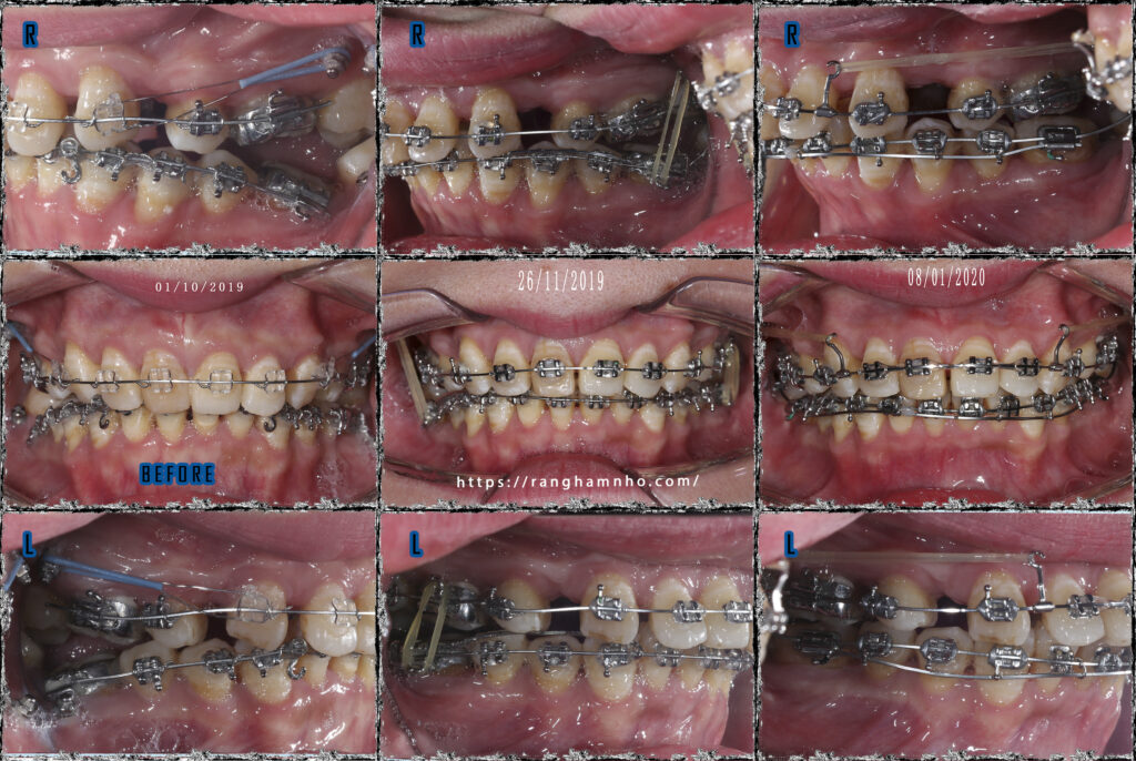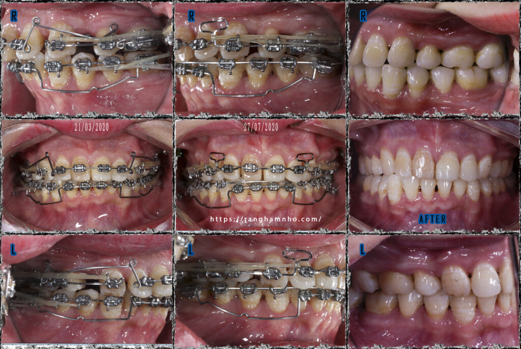 Đóng khoảng, dựng trục, chỉnh khớp cắn và kết thúc sớm cho BN. Tình trạng khớp cắn đã tương đối ổn định, nhóm rằng hàm tiếp khớp tốt. Bệnh nhân ăn nhai tốt, các khoảng đã đóng kín, thẩm mỹ khuôn miệng cười cải thiện nhiều sau điều trị.