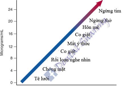 – Hưng phấn thần kinh (kích động, thay đổi thính giác, vị kim loại hoặc khởi phát đột ngột các triệu chứng tâm thần), sau đó là co giật rồi tiếp theo là ức chế thần kinh (ngủ gà, hôn mê hoặc ngừng thở).