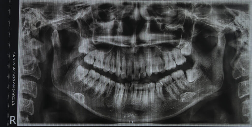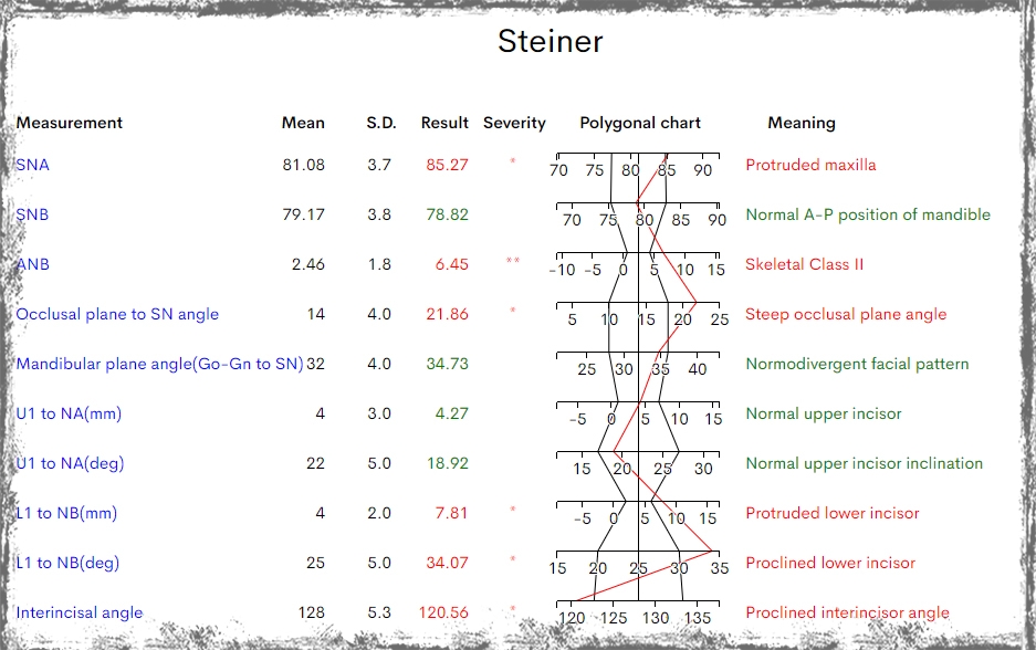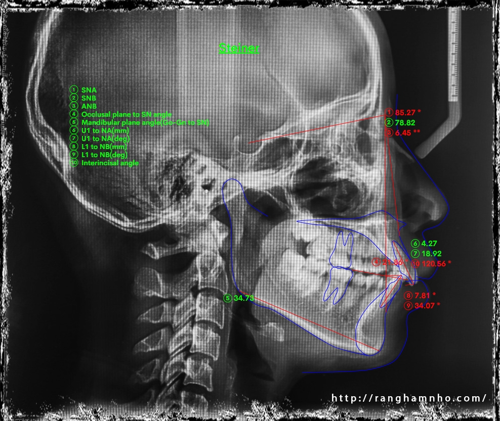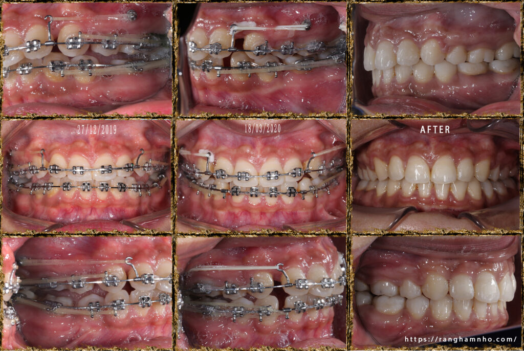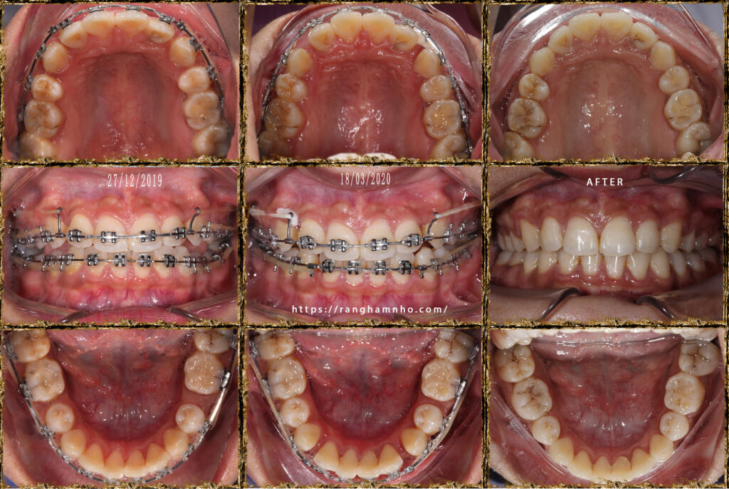 Chẩn đoán trước điều trị: sai khớp cắn hạng II, mặt hô, khớp cắn sâu. Chỉ định niềng răng nhổ 4 răng số 4 để kéo lùi nhóm răng cửa giảm hô tối đa. Có sử dụng neo chặn tuyệt đối bằng minivis chỉnh nha.