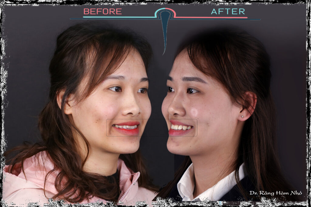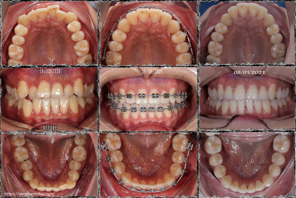 BN nữ sinh năm 1997 đến phòng khám với tình trạng khớp cắn ngược, răng hàm dưới nằm phủ ngoài răng hàm trên. Cung hàm trên hẹp, răng chen chúc. Cả hai cung răng hàm trên và hàm dưới có dạng vuông, khuôn răng rộng cười kém tươi.
