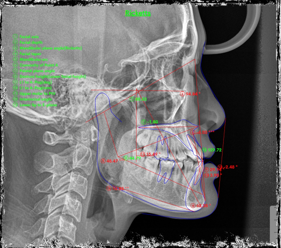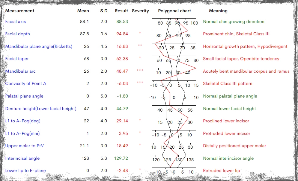 Trên kết quả chụp phim xquang mặt nghiêng cephalometric chuẩn hóa, cho kết quả sai hình xương hạng III (mặt lưỡi cày), trục răng cửa trên và cửa dưới đã bù trừ nhiều.