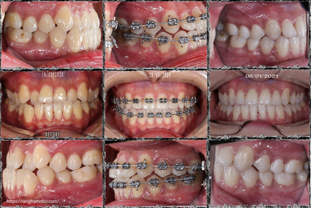 BN nữ sinh năm 1997 đến phòng khám với tình trạng khớp cắn ngược, răng hàm dưới nằm phủ ngoài răng hàm trên. Cung hàm trên hẹp, răng chen chúc. Cả hai cung răng hàm trên và hàm dưới có dạng vuông, khuôn răng rộng cười kém tươi.