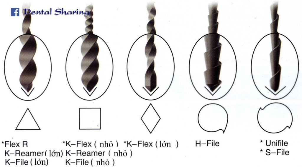 (y) Hình ảnh thiết diện của một số dụng cụ nong dũa ống tủy bằng tay. Hiệu quả hơn, phổ biến hơn và dùng nhiều hơn trên lâm sàng hiện nay là các file K. Các file H, S, R thường dùng cho những trường hợp đặc biệt hơn..!