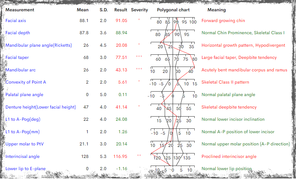 Kết quả phân tích phim mặt nghiêng cephalometric: Sai hình xương hạng II, cằm có xu hướng ra trước , cắn sâu khung xương.