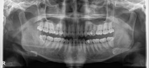 Bệnh nhân nữ, hô hàm trên & cười hở lợi. Môi trên mỏng, hớt, góc mô căm nhọn. Cung răng hàm dưới thiếu 1 răng cửa bẩm sinh.